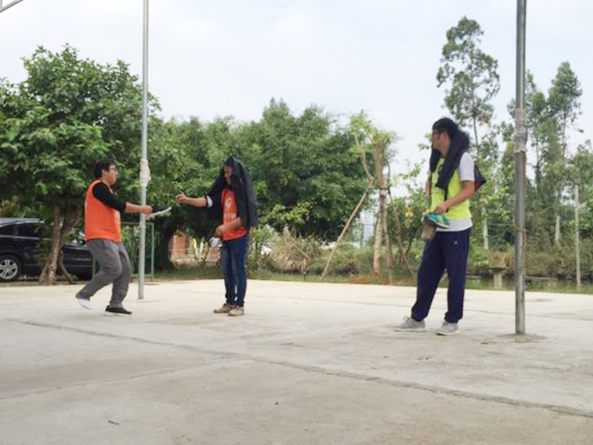 在小队里要选出一位有指挥能力的同学来当这个队伍里的“仙人”,这个人要用肢体动作来提示整个队伍该怎么走才能教官事先准备好的道具。而其他队员就要被蒙上眼睛并把手搭在前一个人的肩膀上。服从命令,听从指挥,才能把任务快速完成。