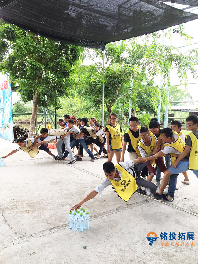 群龙取水:团队每个成员在全队成员的协助下在规定的距离内完成取到特定的水瓶。这个项目可以很好的让每个学员克服自己的心理障碍,充分的相信自己的队友,整个团队只有相互帮助,相互合作才能共同完成目标。